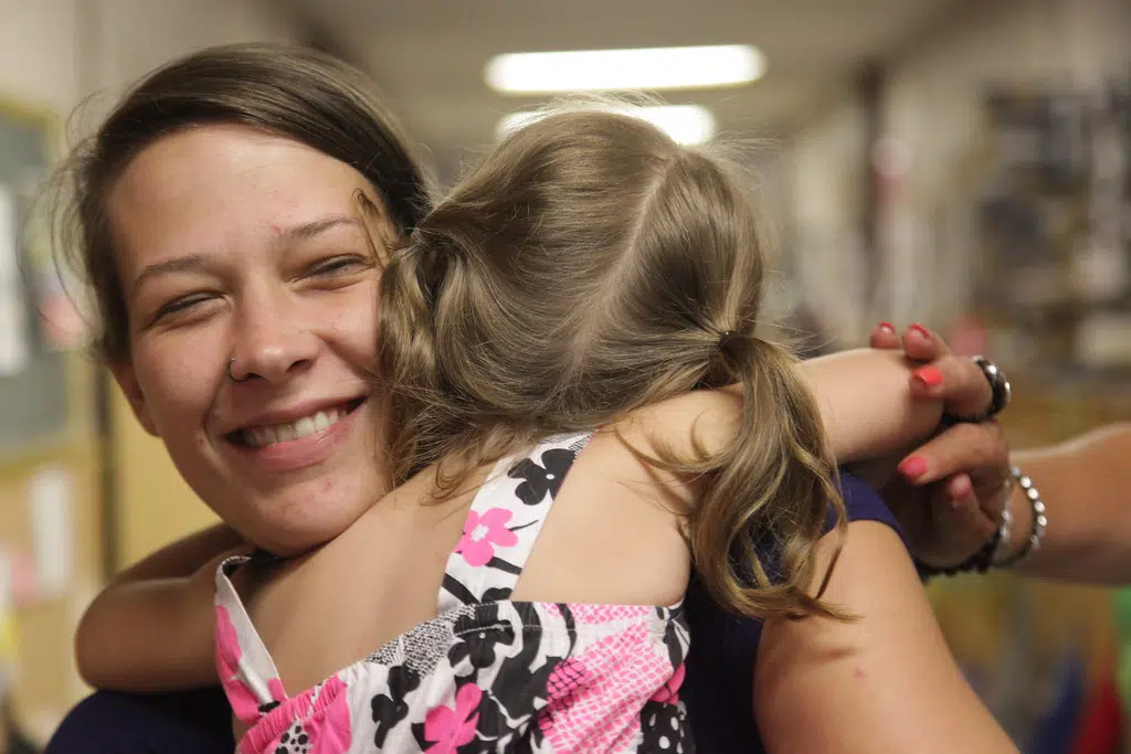 Stromski was delighted when the Greens brought over the hugging machine, she yelled at her husband and kids, “Come out here and look at what they made me … I’m going to get to hug one of my students!” The creation uses thick clear plastic as a curtain and huggers wear disposable bags to hug through it and mask-wearing is still required.