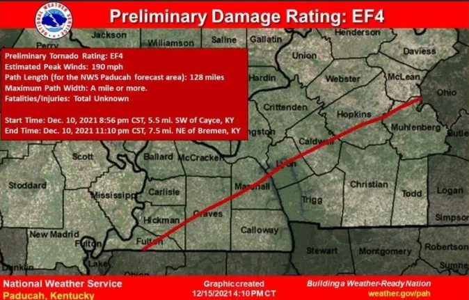 NWS officials say they have determined the tornado that traveled from Fulton County to Muhlenberg County as an EF-4 tornado.