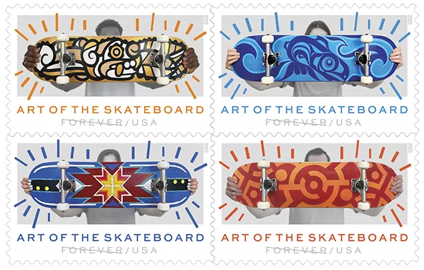 - These four stamps celebrate the Art of the Skateboard with vibrant designs that capture skateboarding’s excitement and reflect the diversity and influences of the four artists whose work is featured: